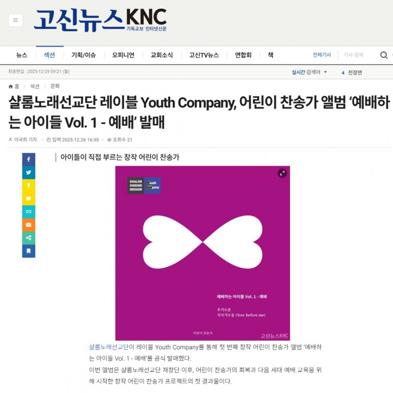 [기사] 샬롬노래선교단 레이블 Youth Company, 어린이 찬송가 앨범 ‘예배하는 아이들 Vol. 1 - 예배’ 발매(고신뉴스 KNC)