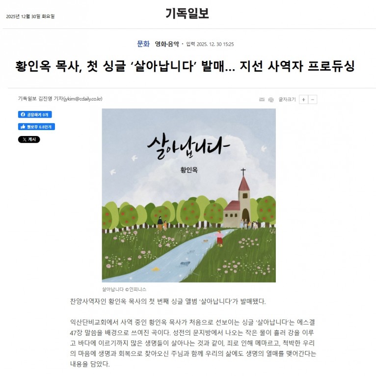 [기사] 황인옥 목사, 첫 싱글 ‘살아납니다’ 발매… 지선 사역자 프로듀싱(기독일보)