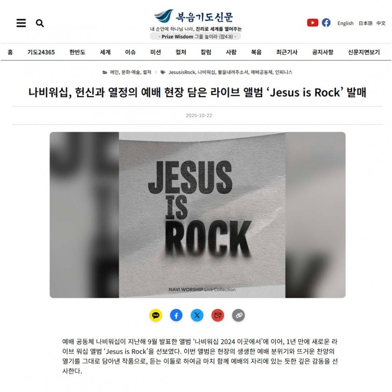 [기사] 나비워십, 헌신과 열정의 예배 현장 담은 라이브 앨범 ‘Jesus is Rock’ 발매(복음기도신문)