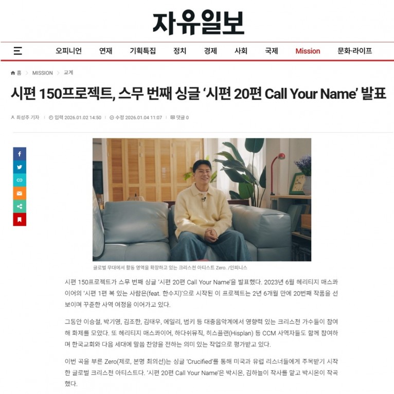 [기사] 시편 150프로젝트, 스무 번째 싱글 ‘시편 20편 Call Your Name’ 발표(자유일보)